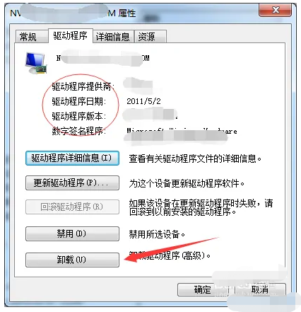 2、双击上述显卡名字位置,进入显卡属性,在属性可以查看到显卡的驱动信息,点击下方的【卸载驱动】完成电脑的现有驱动的卸载。卸载之后即重新安装驱动。