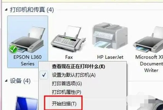 2、将需要扫描的文件有字页面朝下放置在该打印机盖板下面。来到电脑的设备和打印机列表界面后,选中该打印机鼠标右键,选择开始扫描进入。