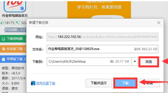 点击“浏览”,选择储存位置,点击“下载”,因为并没有官方的作业帮电脑版,所以我们下载的并不是作业帮软件,还需要下载一个安卓模拟器才能正常运行作业帮。