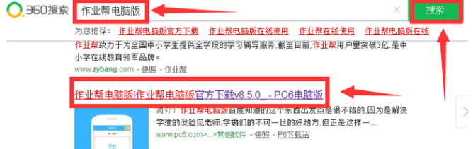 打开360浏览器,在搜索框内输入“作业帮电脑版”,点击搜索,搜索结果出来后,点击图示网站进行下载。