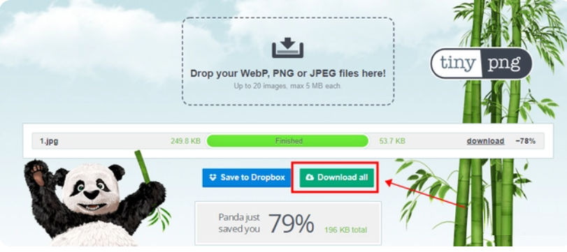 2、照片上传后系统会自动进行压缩,我们耐心等待即可,如下图所示,原本249.8KB的照片被成功压缩掉了79%,压缩后大小只有53.7KB了,这时候再点击“Download all”按钮即可下载压缩后的照片。