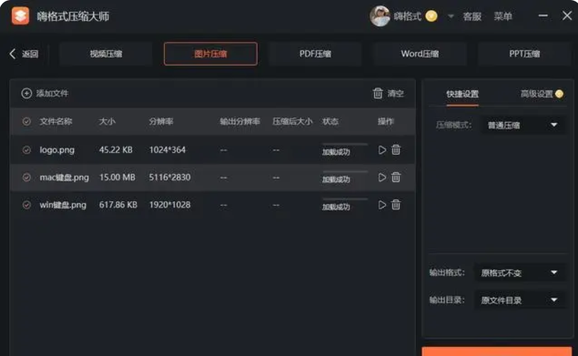 嗨格式压缩大师是一款专业的压缩软件,主要支持五种压缩功能,包括图片压缩、视频压缩、PDF压缩、Word压缩和PPT压缩,且支持压缩的图片格式比较丰富,常用的jpg、png、bmp、tif等格式均能使用。