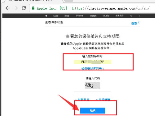 5、输入在iPhone手机上的序列号以及查询验证码,点击继续。