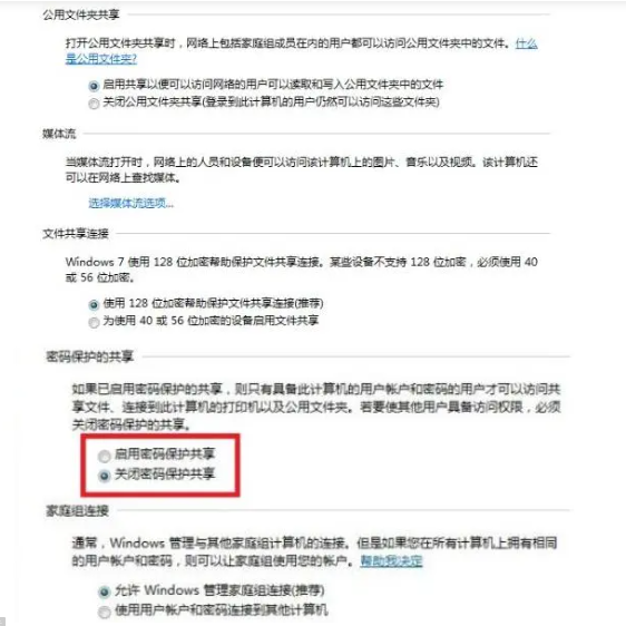 3、将启用网络发现、启用文件以及打印机共享、关闭密码保护共享三个都勾选上,点击保存设置即可。