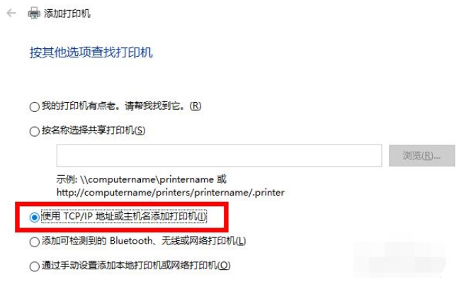 5、继续点击“使用TCP/IP地址或主机名添加打印机”。
