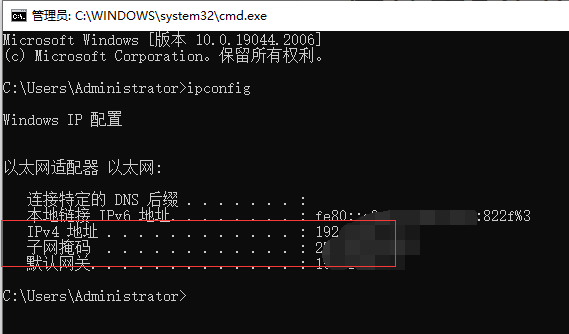 7、不清楚电脑ip地址的话,可以直接使用win+r键打开运行,输入cmd回车进入命令提示符,然后再输入“ipconfig”后按回车键即可查看电脑的ip地址。