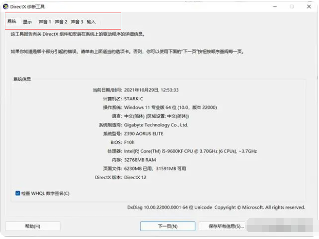 2、dxdiag也就是DirectX诊断工具,进入后就可以查看目前的系统,内存,显卡,及显示器和其它输入设备的信息,并且核心功能还可以用来诊断系统有关DirectX的错误。