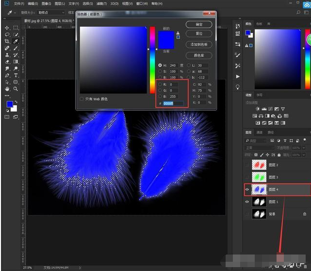 9、Ctrl+D取消选,择关闭图层1显示,然后打开图层2 3 4显示;按住Ctrl键选中图层2 3 4,将混合模式设置为滤色,再Ctrl+E合并图层,羽毛就被完整抠出来了。