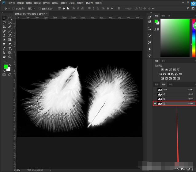 5、关闭显示并回到图层1,选择通道面板—绿通道—按住Ctrl键点击缩览图载入选区。