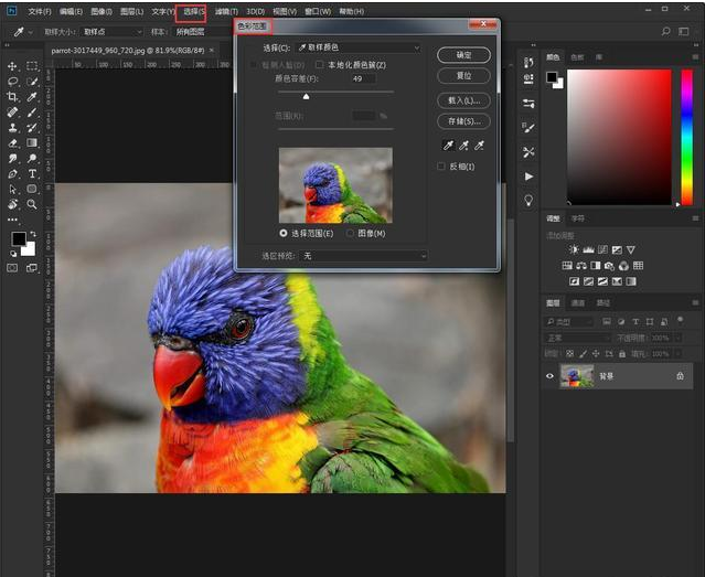 4、色彩范围: 通过背景色来抠图,适用于图像和背景色色差明显,背景色单一,图像中无背景色。对图像中带有背景色的不适用。