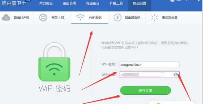 4、在路由设置页面点击下面的wifi密码,可以看到当前自己的wifi和密码,用鼠标点击选定就可以直接修改,完成之后点击保存设置即可。