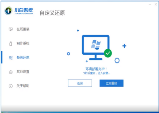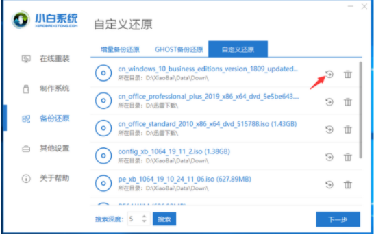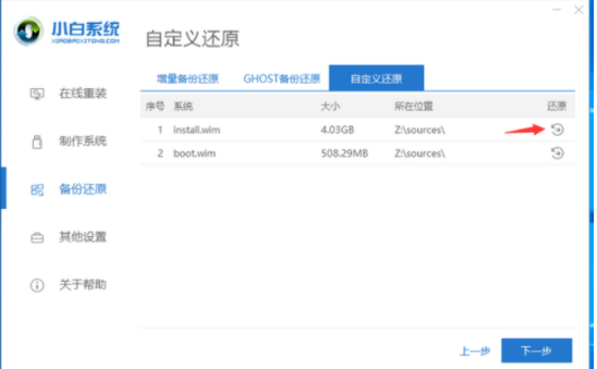 3、在小白一键重装的备份还原界面内我们选择自定义还原,点击系统iso镜像文件后面的还原即可。