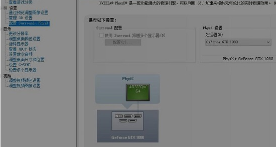 3、完成后继续鼠标点击左侧任务栏中的“配置 surround、physx”,此时,如果你的显卡很旧,但是CPU很新的话一般可以选择CPU,通常都建议选显卡。