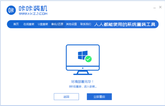 1、首先我们msdn官网上下载好我们需要的iso系统镜像保存在电脑非系统盘上,接着下载安装咔咔装机一键重装系统软件并打开,点击备份还原。