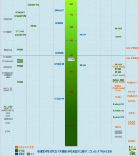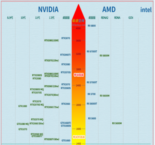 1、以下就是移动平台显卡天梯图,收集的笔记本电脑显卡型号还是比较全面的,基本可以说包括了所有型号的移动显卡。包括 nvidia 独显, amd 独显, intel 核显一级 apple 芯片,括号内的表示显卡功耗。