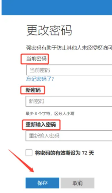 3.然后我们在更改密码界面,先输入当前的密码,再输入要更改的密码两次,点击“保存”。之后就可以用新密码登录微软邮箱了。