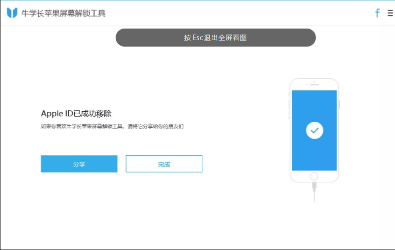 (3)“查找我的iPhone”已关闭。软件检测到设备之后立即解锁,整个移除过程仅需要几秒钟,直到出现移除成功页面。