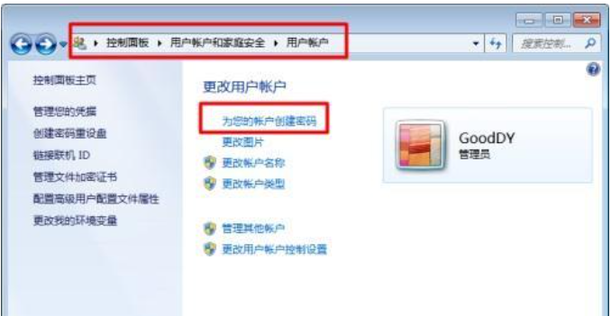 进入“控制面板”、“用户帐户和家庭安全”、“用户帐户”,点击“为您的账户创建密码”,输入密码,点击“创建密码”。