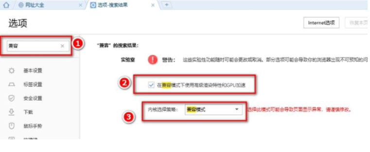 5.若在“高级”选项下找不到“兼容模式”,在设置页面搜索框中输入“兼容”(图示位置1),按下Enter键,在页面上看到“在兼容模式下使用高级渲染特性和GPU加速”和“内核选择策略”。
