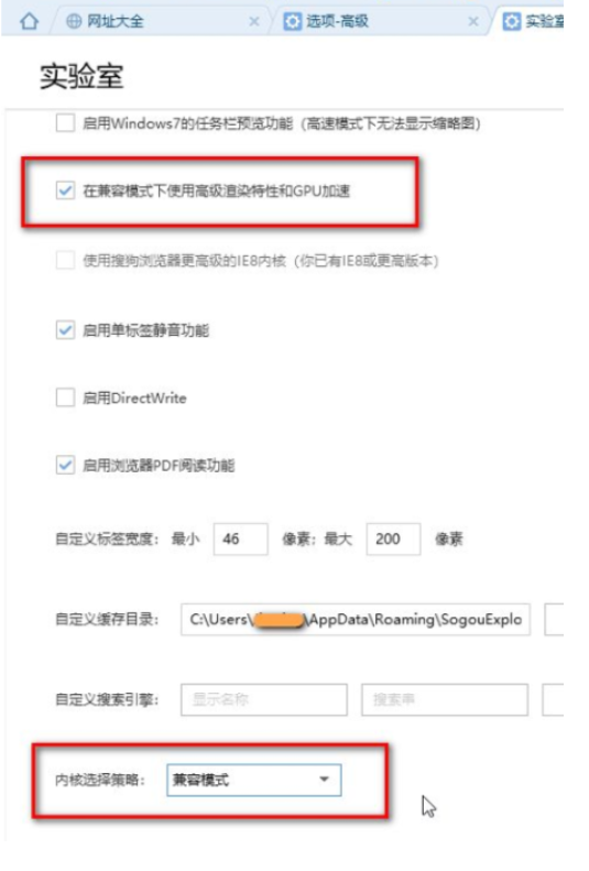 4.再勾选“在兼容模式下使用高级渲染特性和GPU加速”,将内核选择策略更改为“兼容模式”。