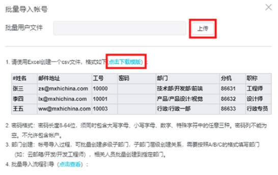 3.通过“导入”批量创建账号,先下载模板,按系统格式要求填写模板后上传,批量创建账号成功。