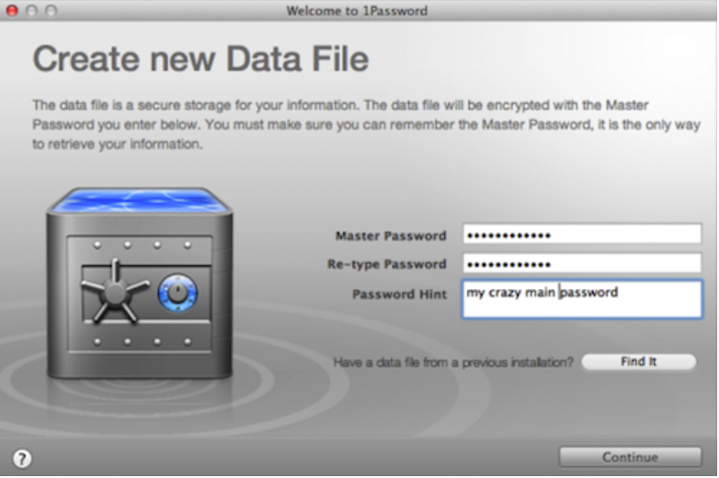 初次运行 1Password 的界面如上图所示,如果你之前没有使用过 1Password,应该直接选择”New Data File(新建数据文件)”,以后你的密码数据都会保存在这个数据文件里面。如果你之前有使用过 1Password 并且已经保存了数据,那么就应该选择”Find Existing(查找已有文件)”,这里我们只是向新用户介绍如何使用。