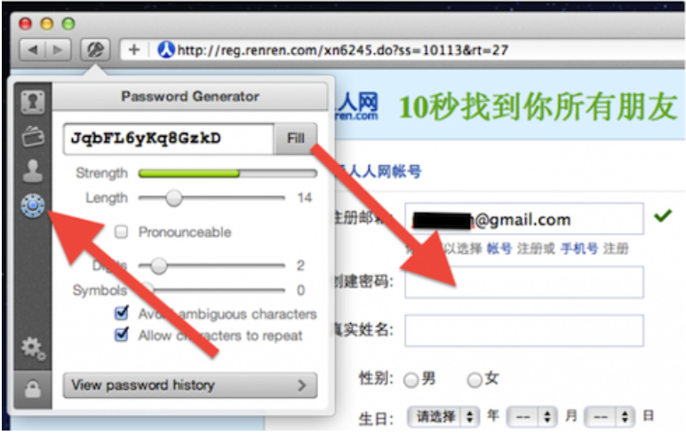也正是因为 1Password 能够帮你自动填写,所以你不必再需要某个具体的网站都用了什么登陆密码,你可以直接将密码修改成一个超强的、自己都无法记住的,并在修改密码之后的第一次登录时,将登陆信息保存到 1Password 中。甚至,1Password 还具有密码生成功能,比如你在注册某网站的时候,就可以按快捷键或点击图标打开 1Password 的插件界面,然后点击界面中的“齿轮状”图标生成一个超强的密码。