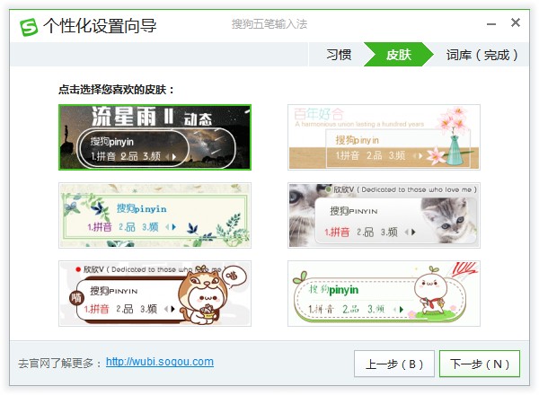 5、点击完成后会进入【个性化设置向导】界面,可对搜狗五笔输入法的使用习惯、皮肤、词库详细参数自定义设置
