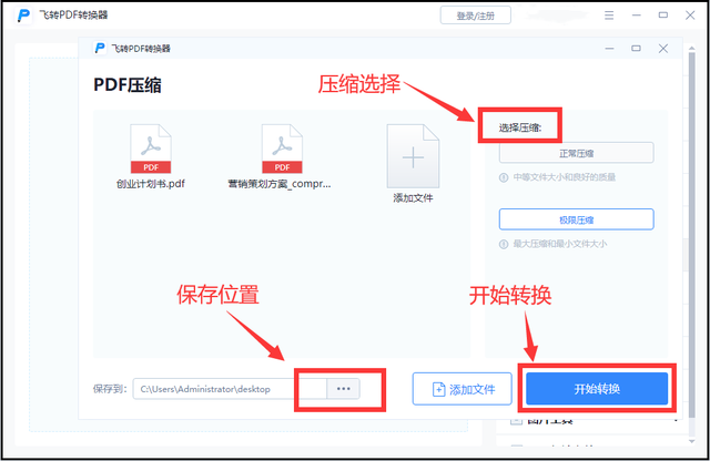 3、文件添加进来后,可以选择压缩等级,有正常压缩和极限压缩,大家根据自己需求选择,然后设置一下保存位置,点击【开始转换】,文件就会压缩成功啦。