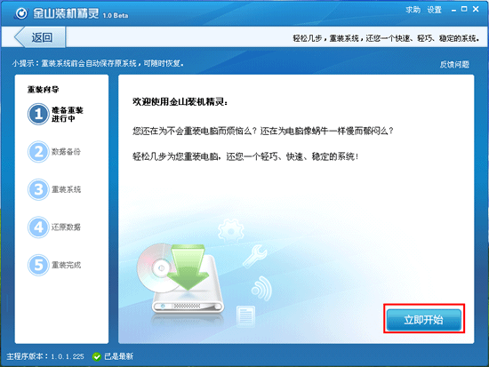 第一步:打开“金山卫士3.0”,选择“重装系统”,进入系统重装界面,第一次使用重装功能,需要认真阅读重装系统用户许可协议,然后点击开始。