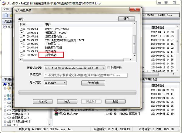 在弹出的警告提示点“是”开始写入,片刻后显示刻录成功,点“返回”,关闭软件。