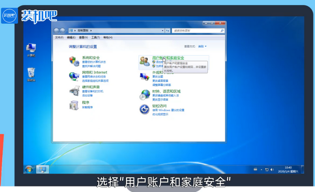 1、打开控制面板,选择“用户账户和家庭安全”。