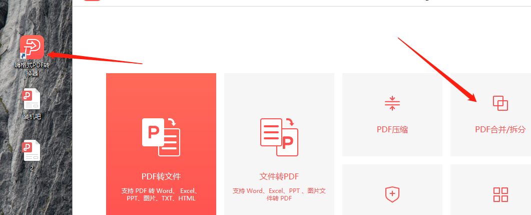 1、如果需要将多个PDF文件合并成一个的话,需要下载PDF文件转换器。下载好以后,打开。选择PDF合并,然后将需要合并的文件拖进去。