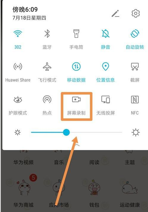 1.首先,我们打开华为手机机,然后向下滑动菜单栏,单击“屏幕录制”,或者同时按住调高音量按钮和电源按钮以开始屏幕录像。