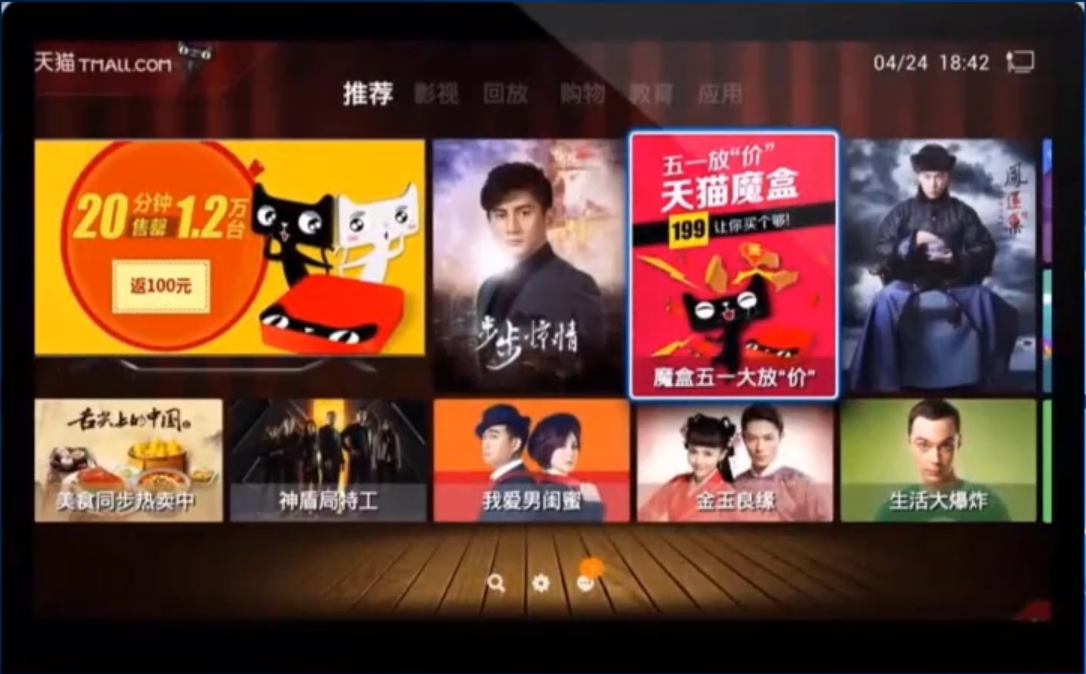 1、以天猫魔盒为例,首先我们打开电视,进入天猫魔盒,在首页是看不到电视直播的入口的。