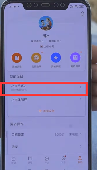 1、首先将手环与小米运动互相绑定,打开小米运动,点击我的,选择手环设备。