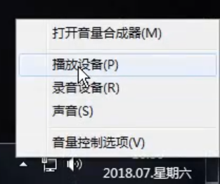1.首先右键点击小喇叭,选择播放设备,弹出声音的界面中,点击默认设备扬声器。