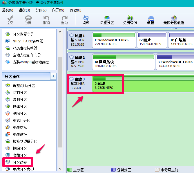1、下载分区助手,将其打开,找到安装的固态硬盘(这里以机械硬盘为例),然后点击左侧的分区对齐。