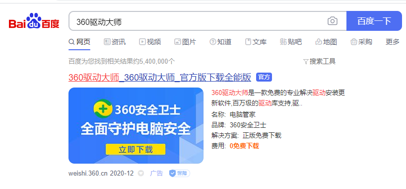 1. 首先,直接在百度上搜索360驱动大师,点击进入官网免费下载。
