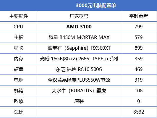 配置说明:这个单子相对低端,属于入门系列,但是3D的性能强过3400G,主板预留B450以及电源550W(还可以加到650W)可以在后续2-3年里面升级CPU+显卡(2060S),该配置对于所有的网游(扣除战地5、逃离塔玛塔夫)在1920x1080都能很好运行,守望先锋,CSGO,坦克世界包括吃鸡在内都没有问题,属于家用入门游戏系列,内存一路到16G,方便DNF搬砖多开。这个CPU也可以加100上3300X,性价比更高。