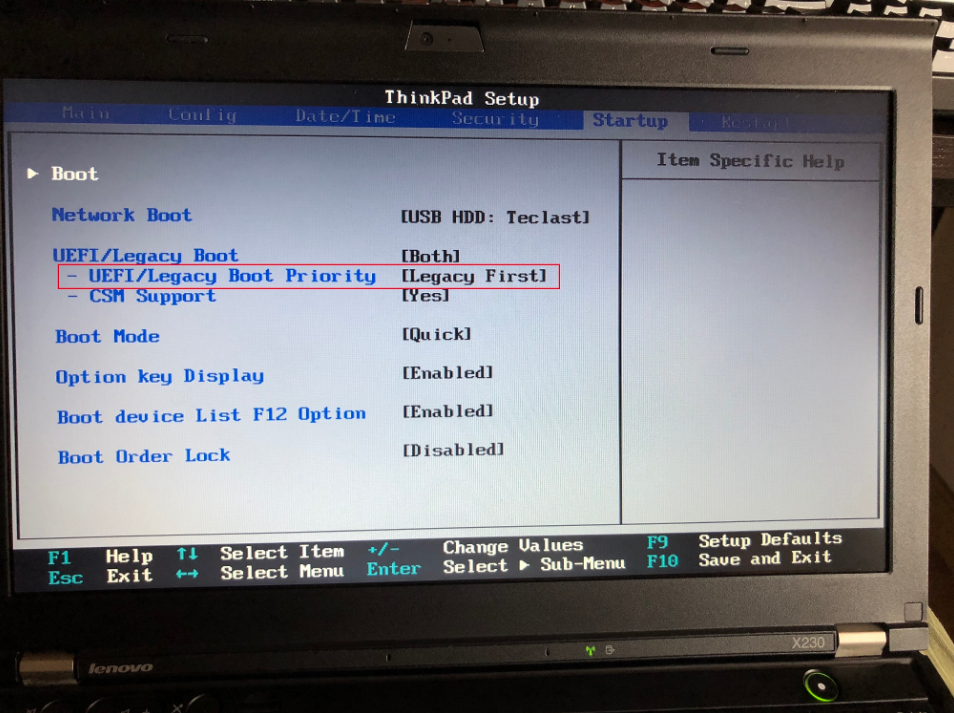 启动之前需要 BIOS配置好,主要是两个,一个是启动项要是 USB,另一个是 BIOS 需要支持 Legacy 启动。开机按 F12 进入 Bios,在启动选项中设置引导模式以及 U 盘为第一启动项,如下面的图所示: