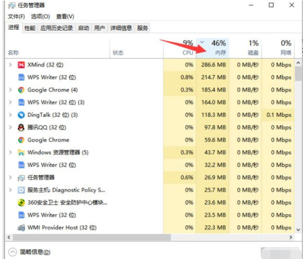 1、内存不足就是电脑死机的最大凶手,重启按下Ctrl+Shift+Esc键,打开任务管理器,点击内存,查看占用内存最多的程序。
