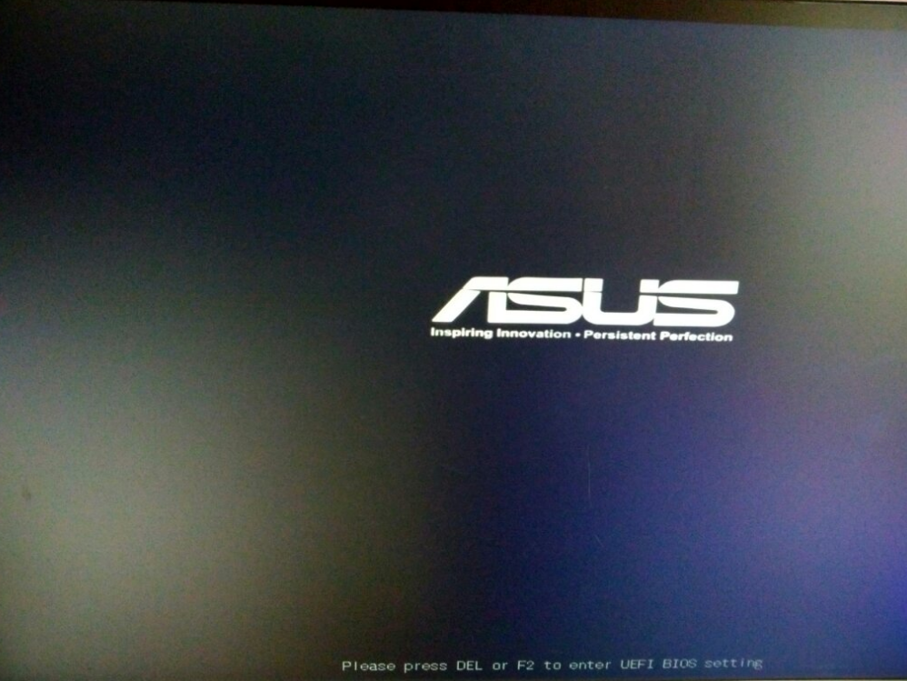 1、一般在开机的时候都会显示电脑品牌 Logo,而在 Logo 下方一般会有一行中文或英文提示,在在华硕这里我们可以看到有一个 Del 和 F2 这两个快捷键,而这正是我们需要的。