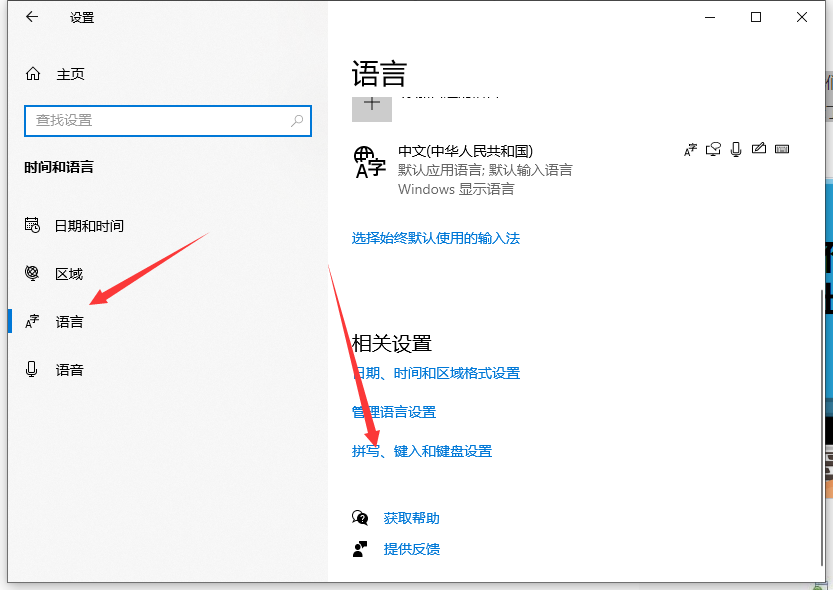 3、在左侧选择语言,然后再右侧往下拉,选择键盘设置。