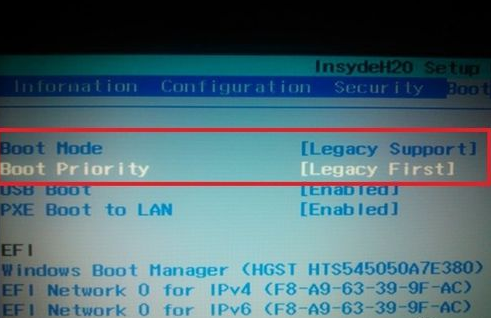 1、将U盘插入电脑,开机显示lenovo品牌界面时,迅速按 Fn+F2组合键,进入BIOS界面,按左右方向键,选择boot选项卡,将Boot Mode与Boot Priorty设置为下图。
