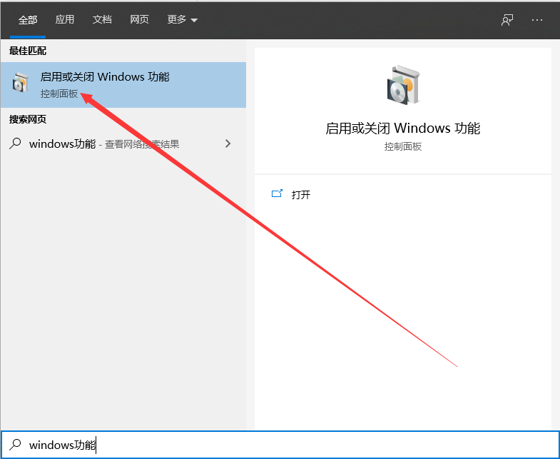 1、首先在win10系统开始菜单旁边的搜索框输入windows功能,并点击启用或关闭windows功能选项。
