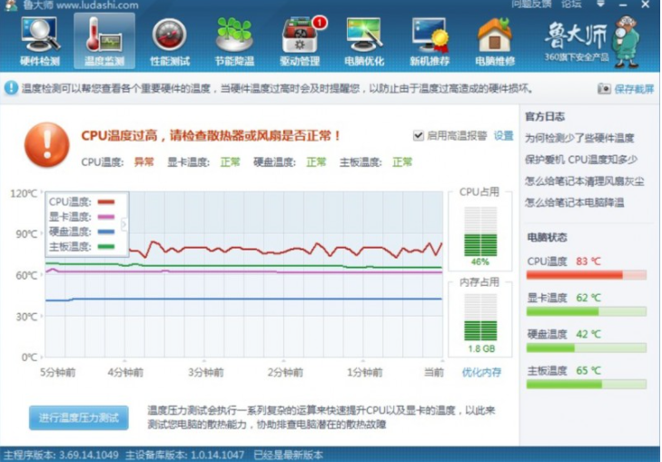 cpu在一般情况下,在45度到65度之间是正常的,一般也不会超过85度。只要CPU温度不高于85度,都是正常范围,cpu是电脑的核心部件,也是产生热量非常集中的区域,所以一般都搭配独立散热器进行降温。