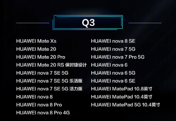 第四季度可升级HarmonyOS的机型包括:华为智慧屏V2021、智慧屏S系列、智慧屏X65、Mate20 X系列、P30系列、MateX、华为畅享20系列、华为麦芒9、华为平板M6、畅享平板2等。