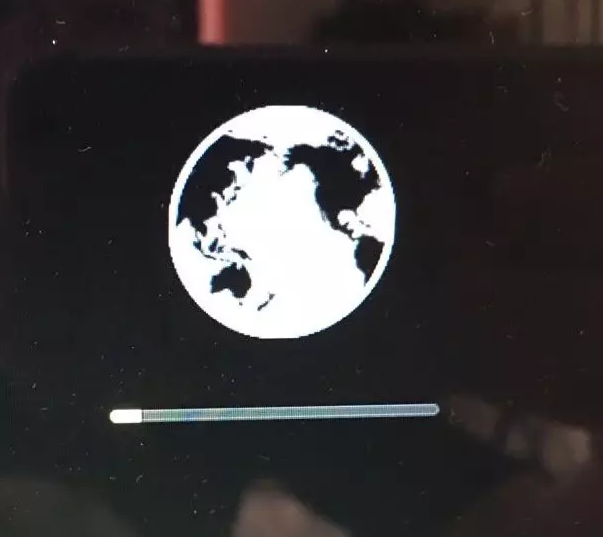 首先,电脑处于关机状态。然后,点击“开机”按钮,之后,马上立马火速用最快的速度,同时按住“command”+r键。直到,看到屏幕出现,恢复系统条(如下图),方可松开。