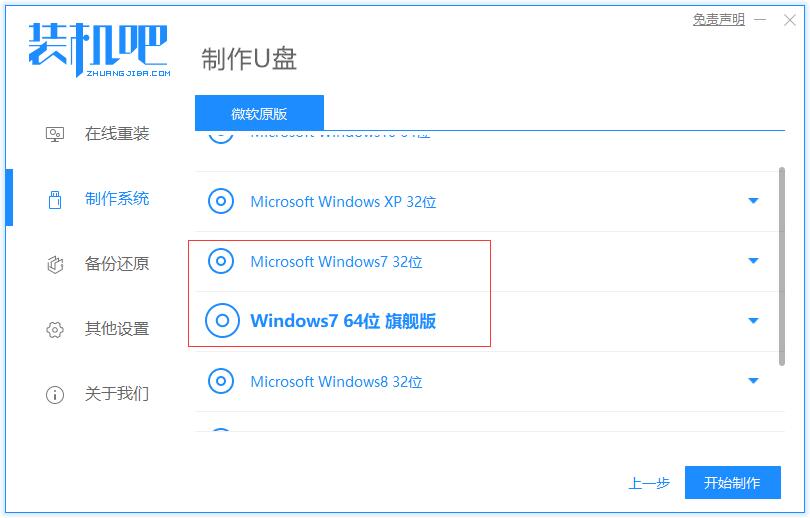 3、根据自身电脑硬件,选择32/64位windows7系统,点击开始制作。